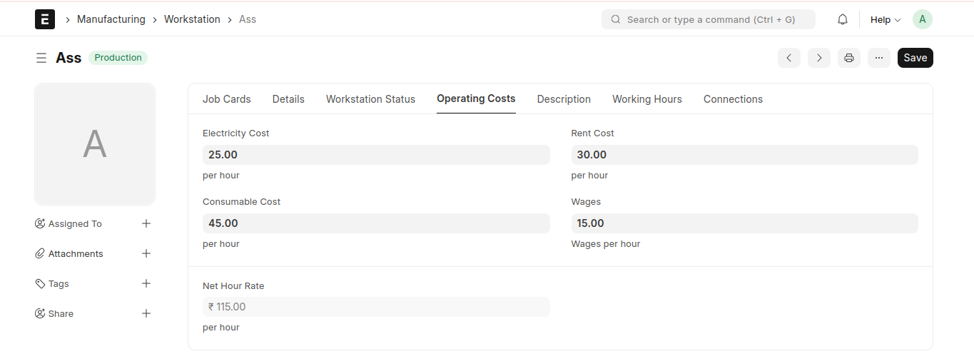 In the Operating Costs tab, enter the Electricity Cost, Rent Cost, Consumable Cost, and Wages, then save.