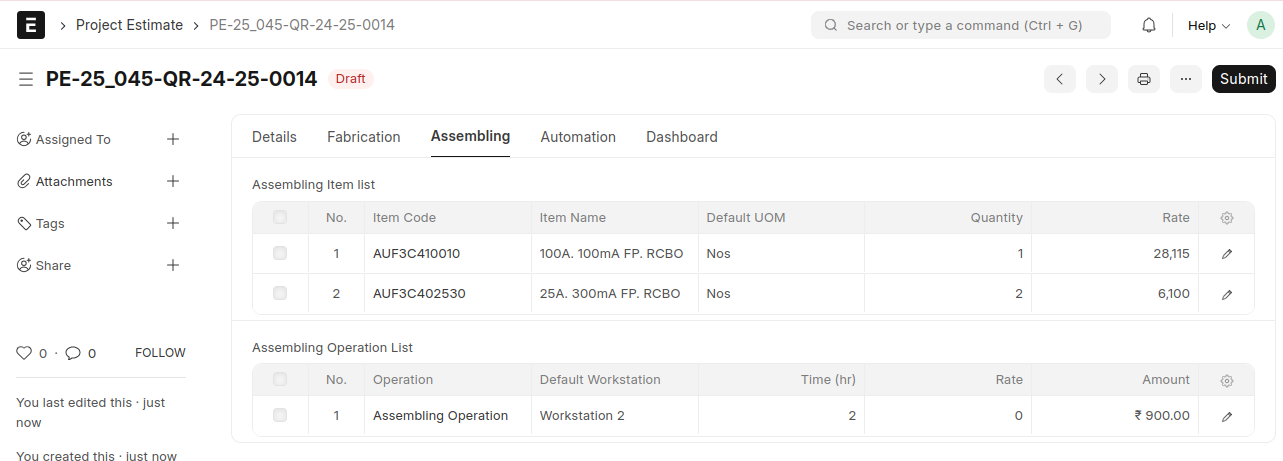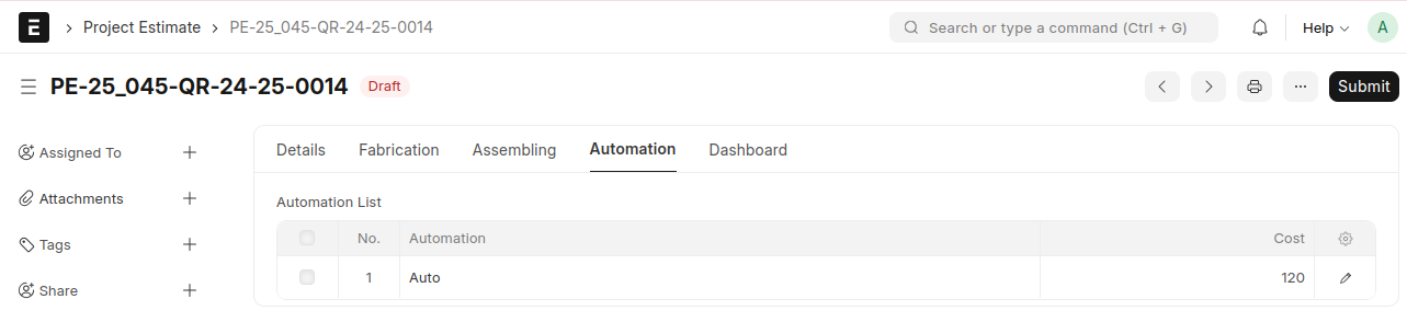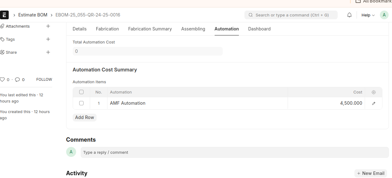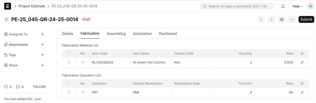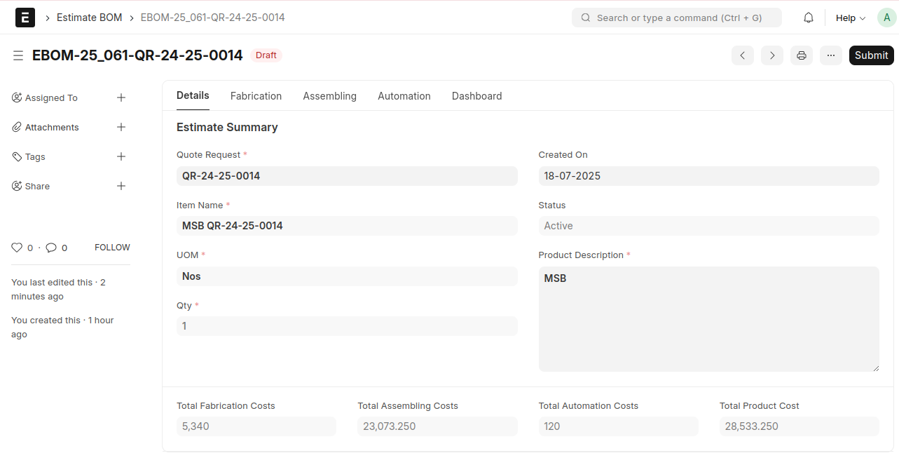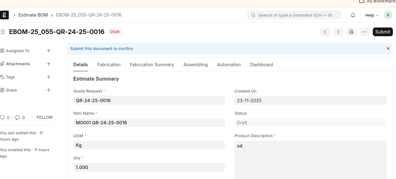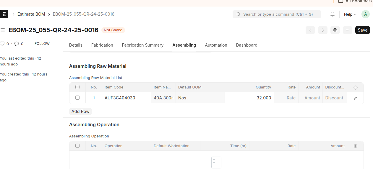 * In the Estimate BOM, the Fabrication, Fabrication Summary, Assembling, and Automation tabs are available.