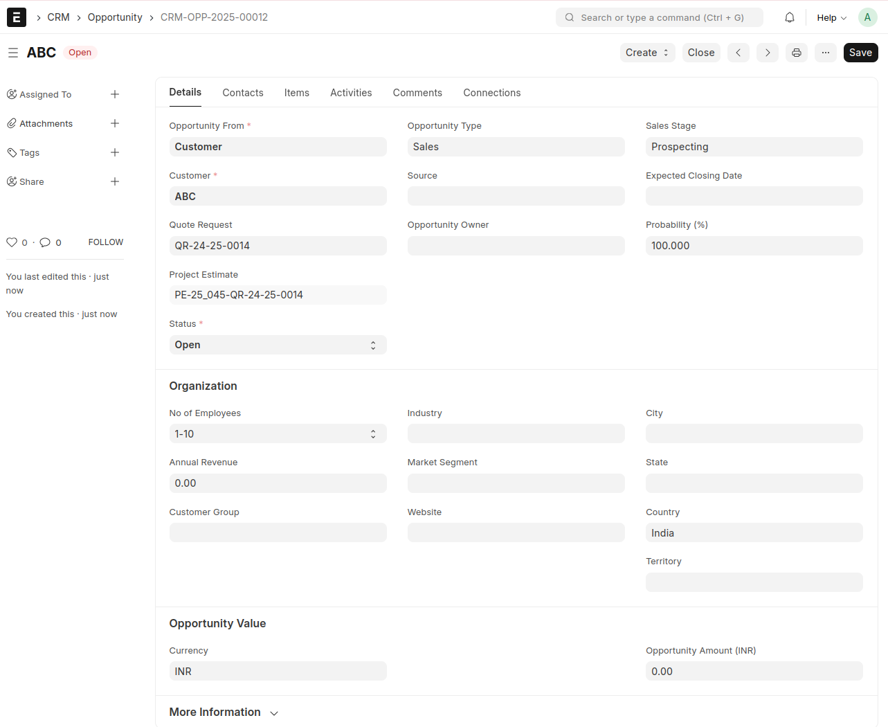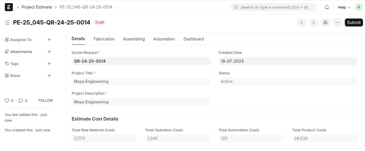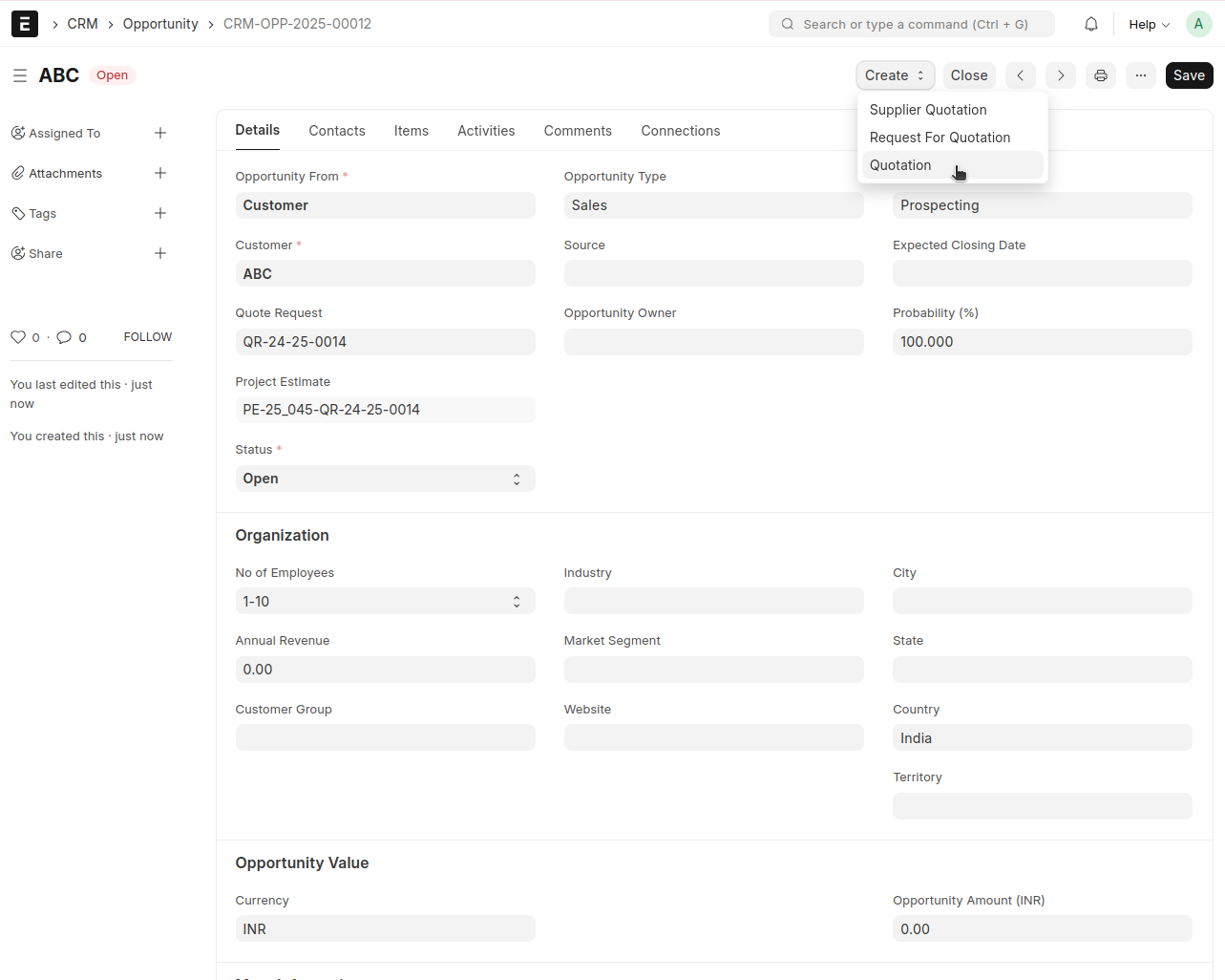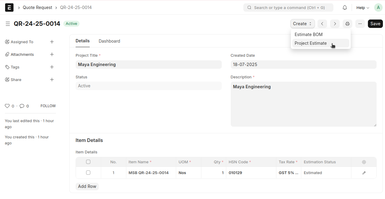 * Select 'Quote Request', the corresponding 'Project Estimate' will be displayed under the Quote Request field