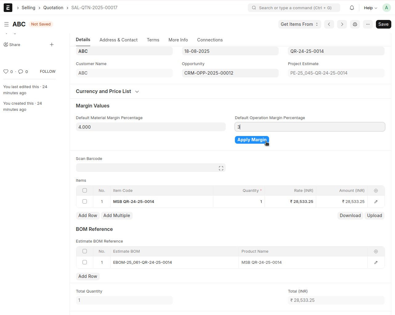 The specified margin percentages will be applied to the 'Estimated BOM Material Cost' and 'Estimated BOM Operation Cost', respectively