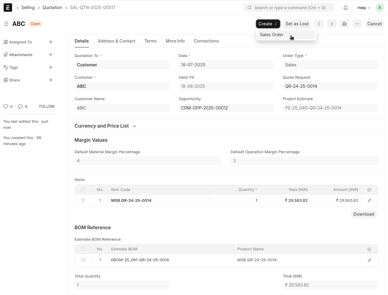 From Quotation → Click on 'Create' Button → Select 'Sales Order'