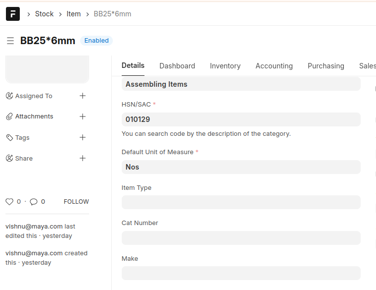 Fill in all the mandatory fields and cat number,make also.Save the document.