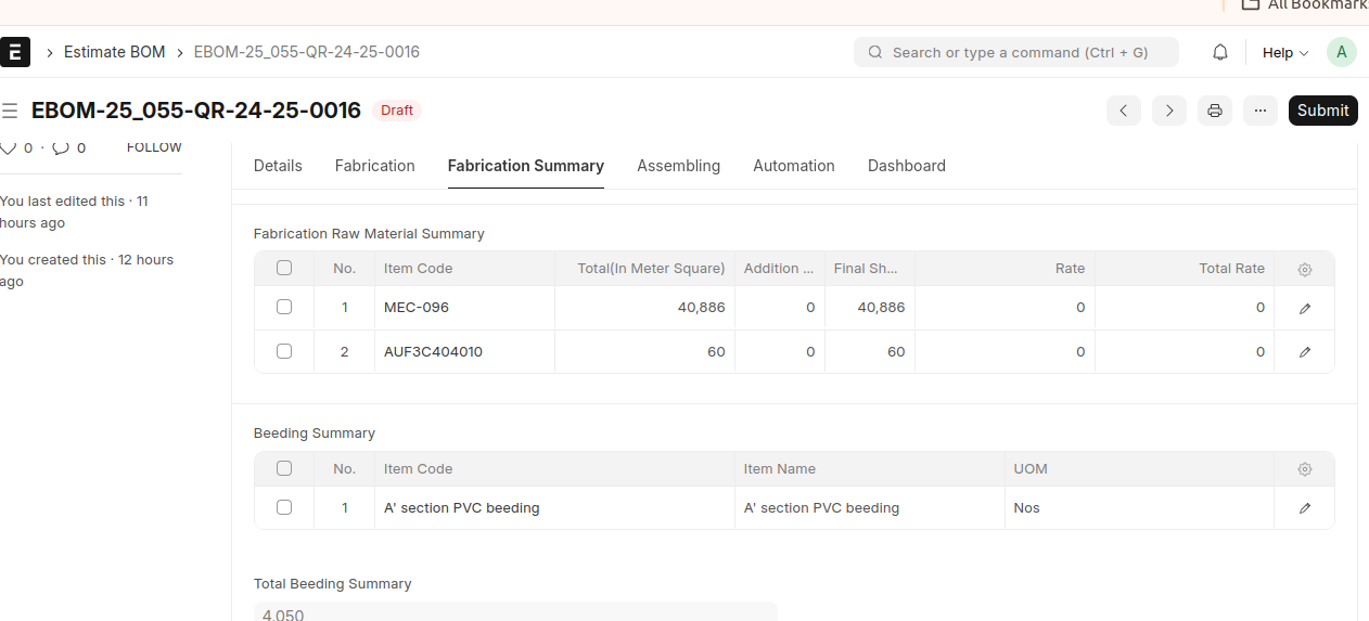 * Select the required items in the child table and enter the corresponding values. Based on the entered values, the calculations are automatically performed and the information is updated in the Fabrication Summary tab(information of sheet metal and foundation channel items) and Beeding Summary(Beeding information only).