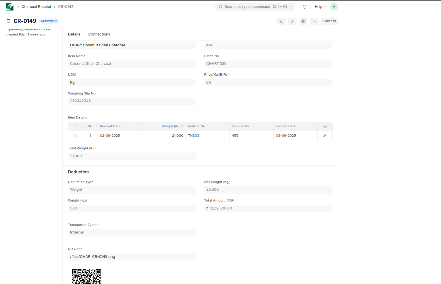 A Charcoal Quality Check document is automatically created when the Charcoal Receipt is saved.