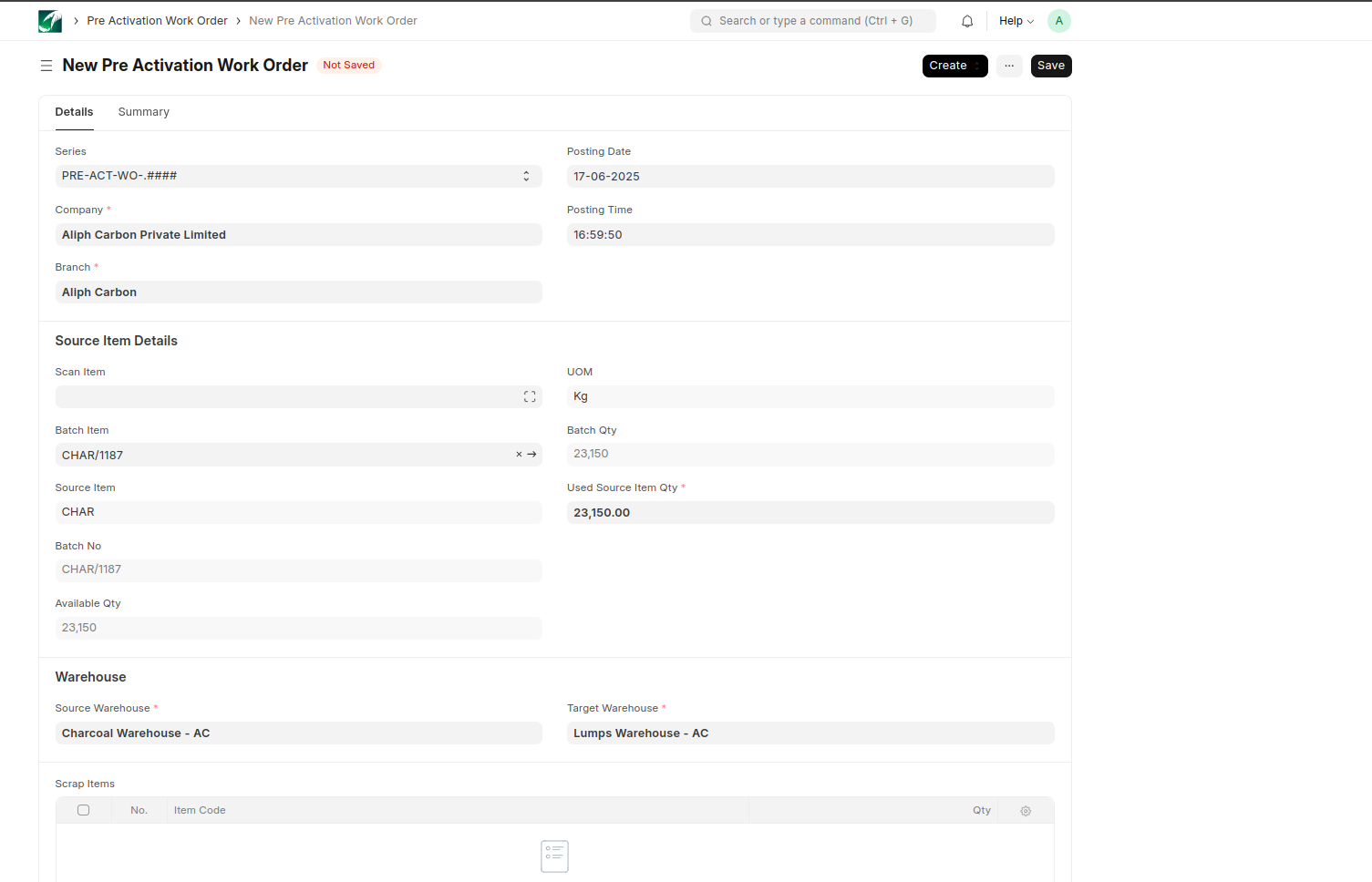 Click the Create button and create a Pre Activation Batch to record the different Lumps batches produced from the selected Charcoal batch through the manufacturing process.