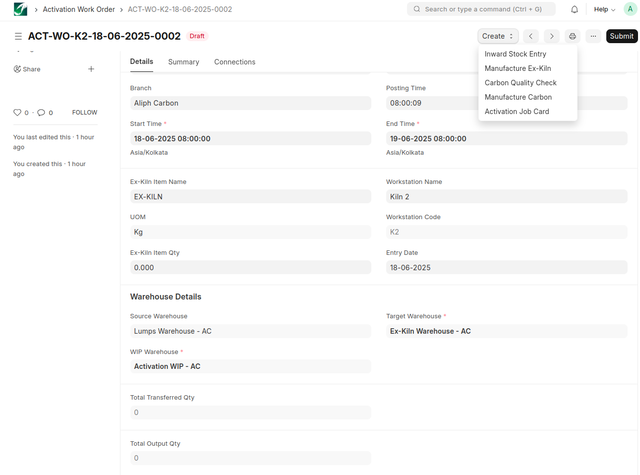 A manufacturing entry is created upon submitting the Pre Activation Work Order document.