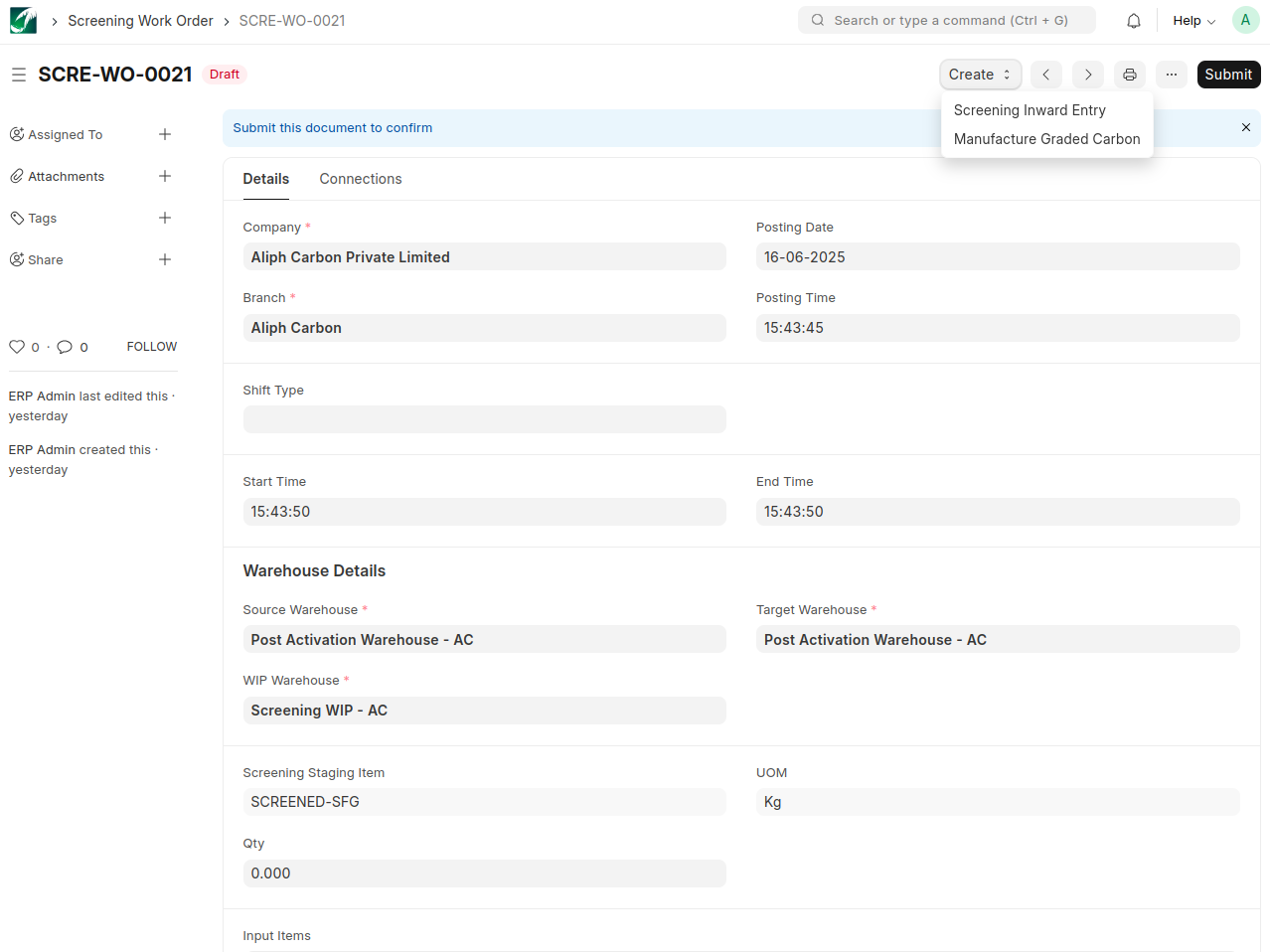 Create inward entries for screening using the ‘Screening Inward Entry’ button. The input items are Activated Carbons , which are transferred to the WIP Warehouse through this entry for the screening process.