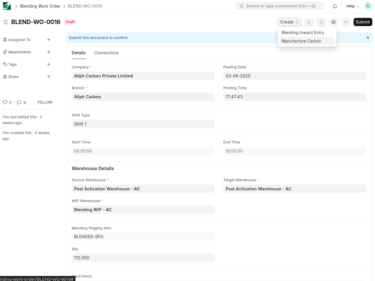 Create inward entries for blending using the ‘Blending Inward Entry’ button. The input items are Activated Carbons , which are transferred to the WIP Warehouse through this entry for the blending process.