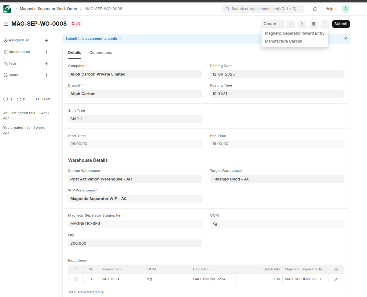 Create inward entries for magnetic separator process using the ‘Magnetic Separator Inward Entry’ button. The input items are Activated Carbons , which are transferred to the WIP Warehouse through this entry for the Magnetic Separator process.