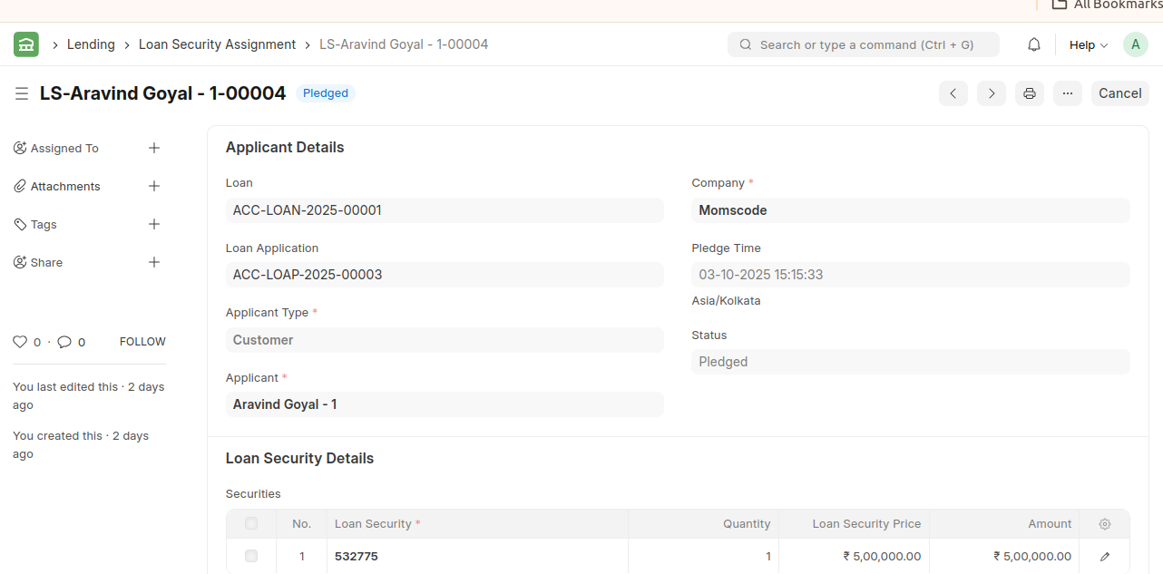 * After Submitting the Loan Document the Loan Security Assignment Status becomes Pledged.The Loan has status disbursed and the create button of Loan Repayment,Loan Write Off,Loan Refund are visible.
