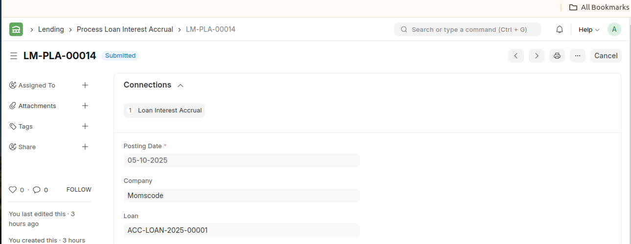 - Process Loan Interest record is created on every loan Interest accrual cycle and is also used for manually processing loan interest accrual.