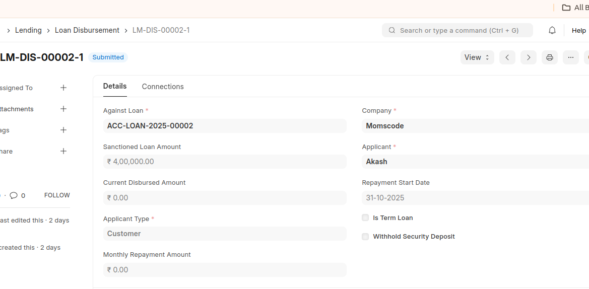 Once a Loan is sanctioned, the loan amount is ready to be disbursed. For that, a Loan Disbursement entry is created.