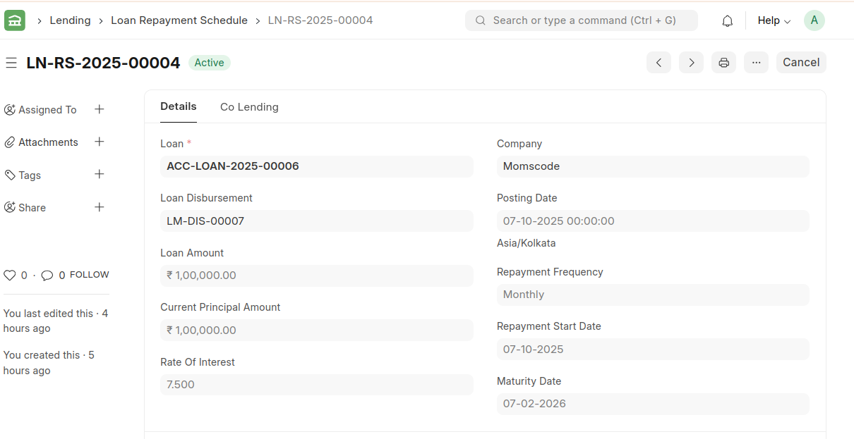 - Automatically generates installment schedules (EMIs) based on loan terms.