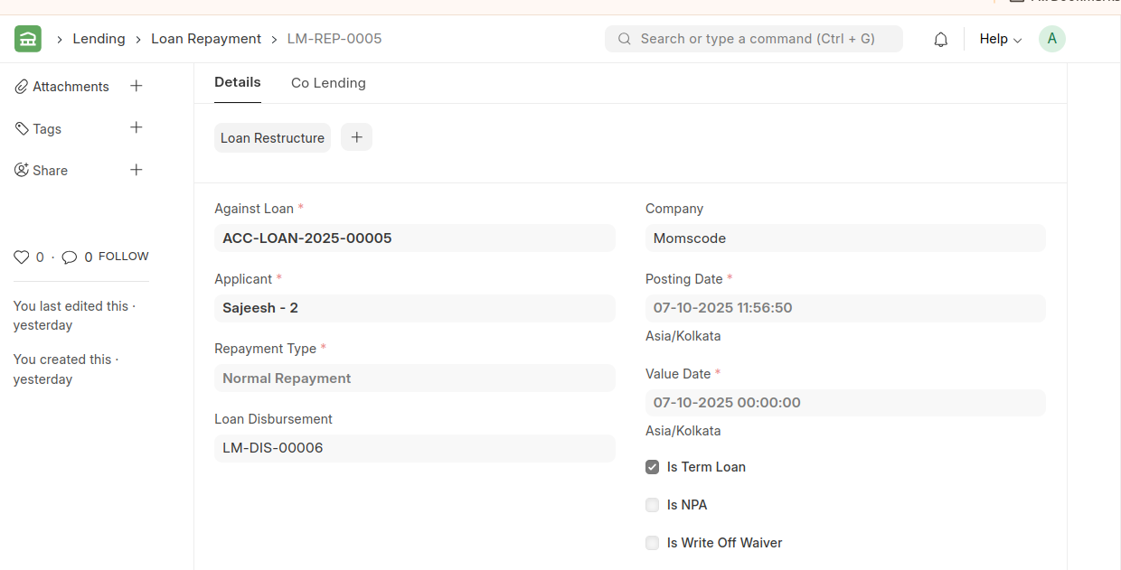 - Loan record acts as a loan account which contains all the applicant details, repayment schedule, and repayment info.