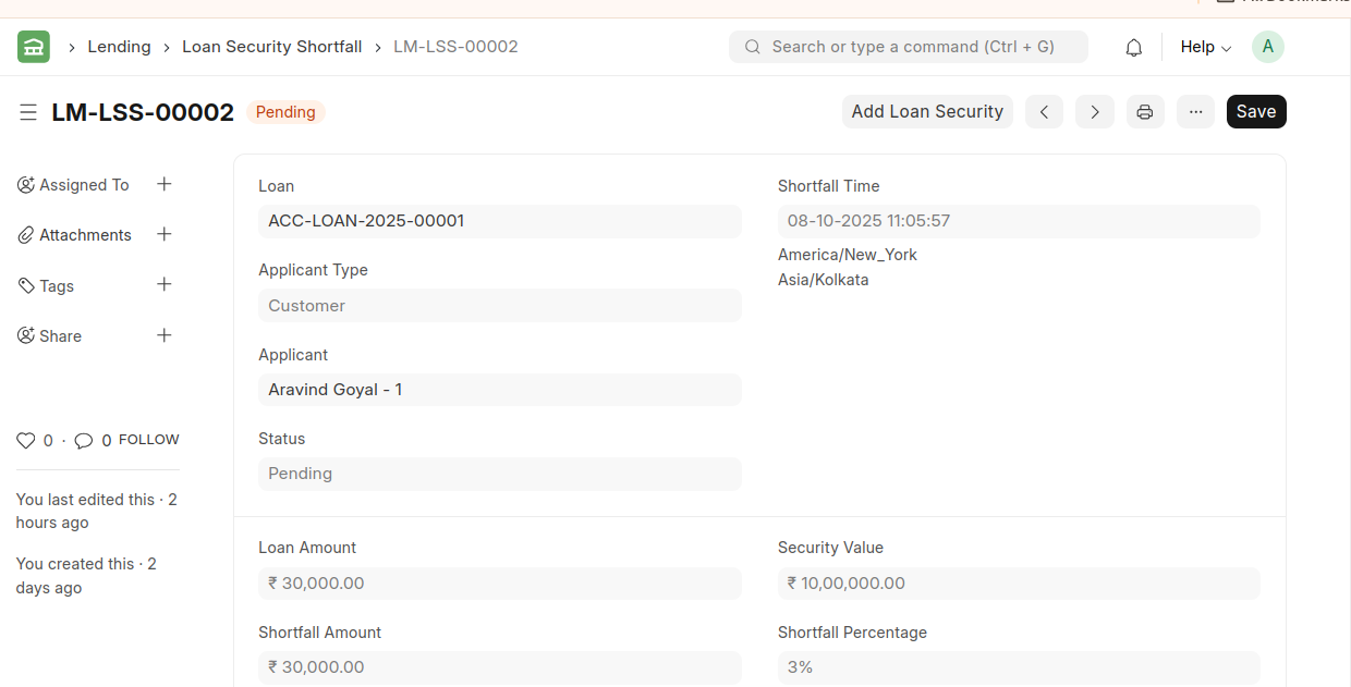 - If loan to security value ratio falls below a specific value, a Loan Security Shortfall is automatically created for that specific loan.