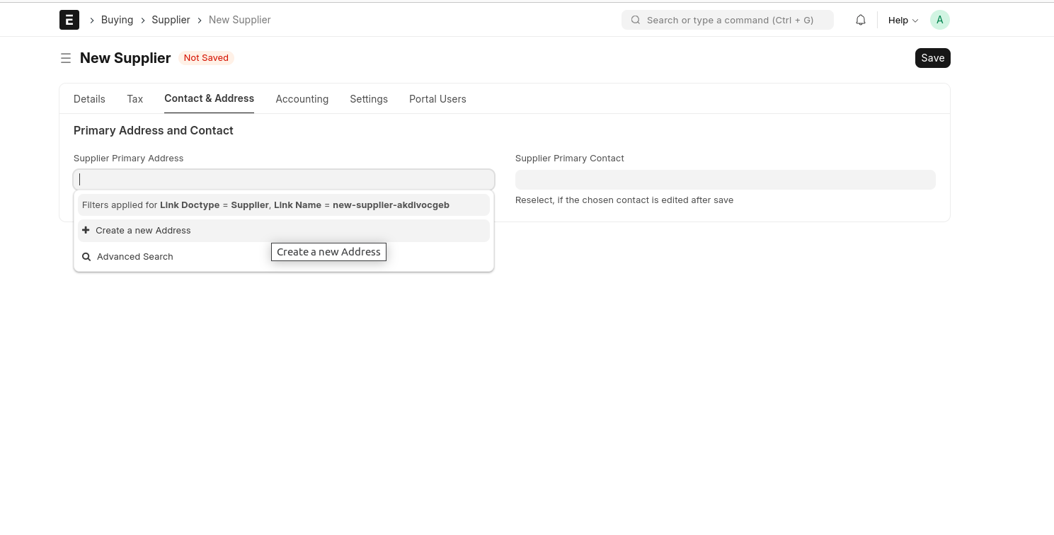 If The Supplier Have Address, Click 'Create A new Address' and Fill The Fields and Save