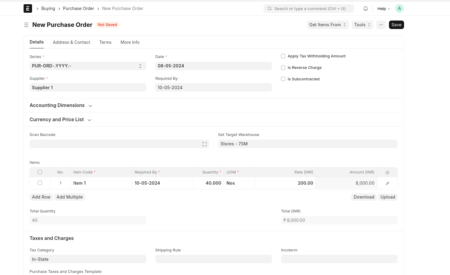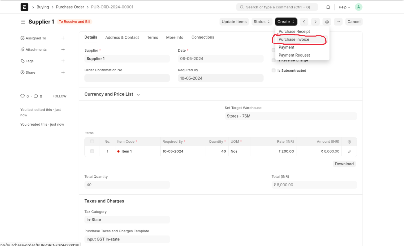 Save The Purchase Order And Submit Then Create 'Purchase Invoice'