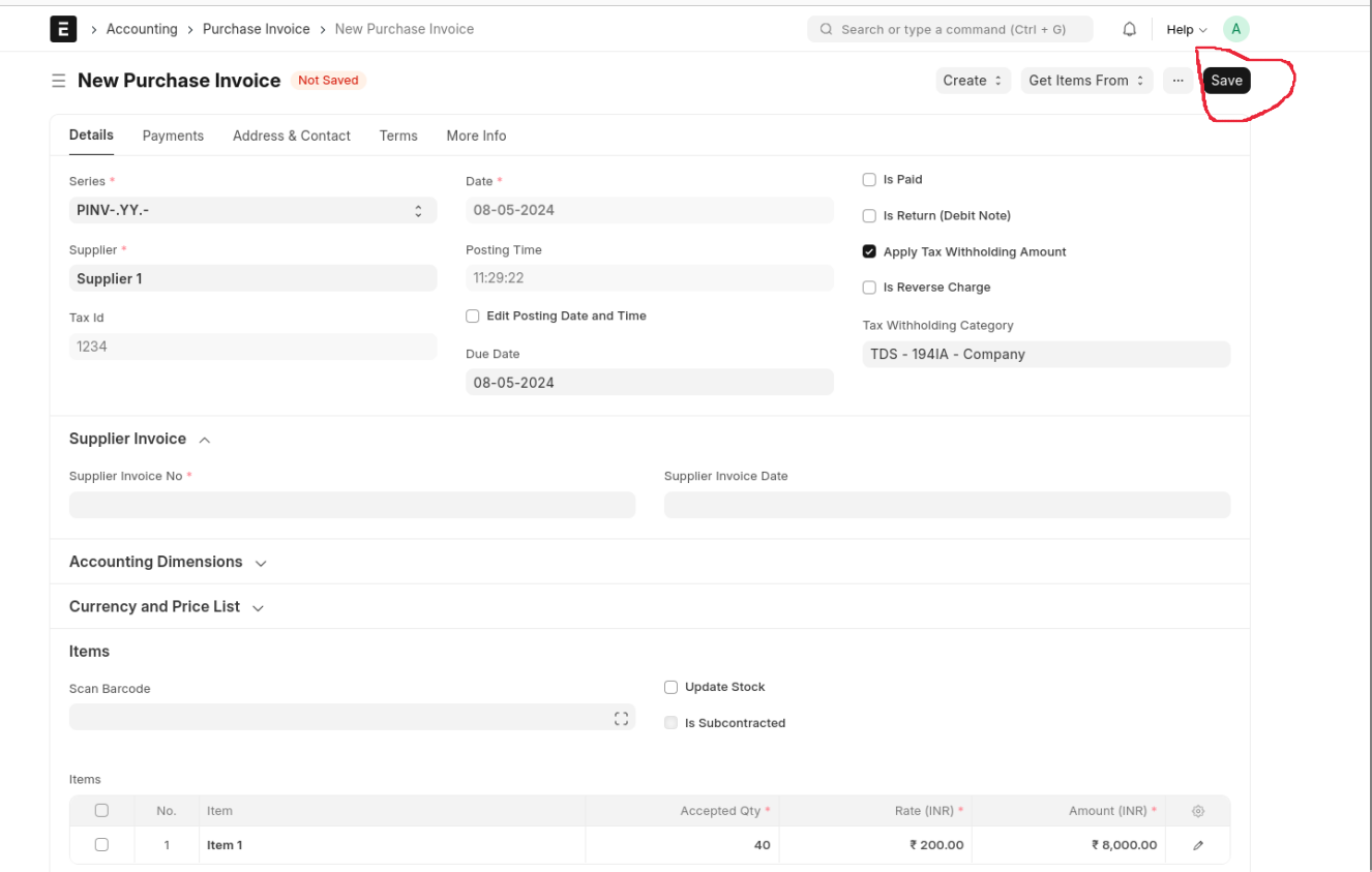 Enter Supplier Invoice No and Save The Document