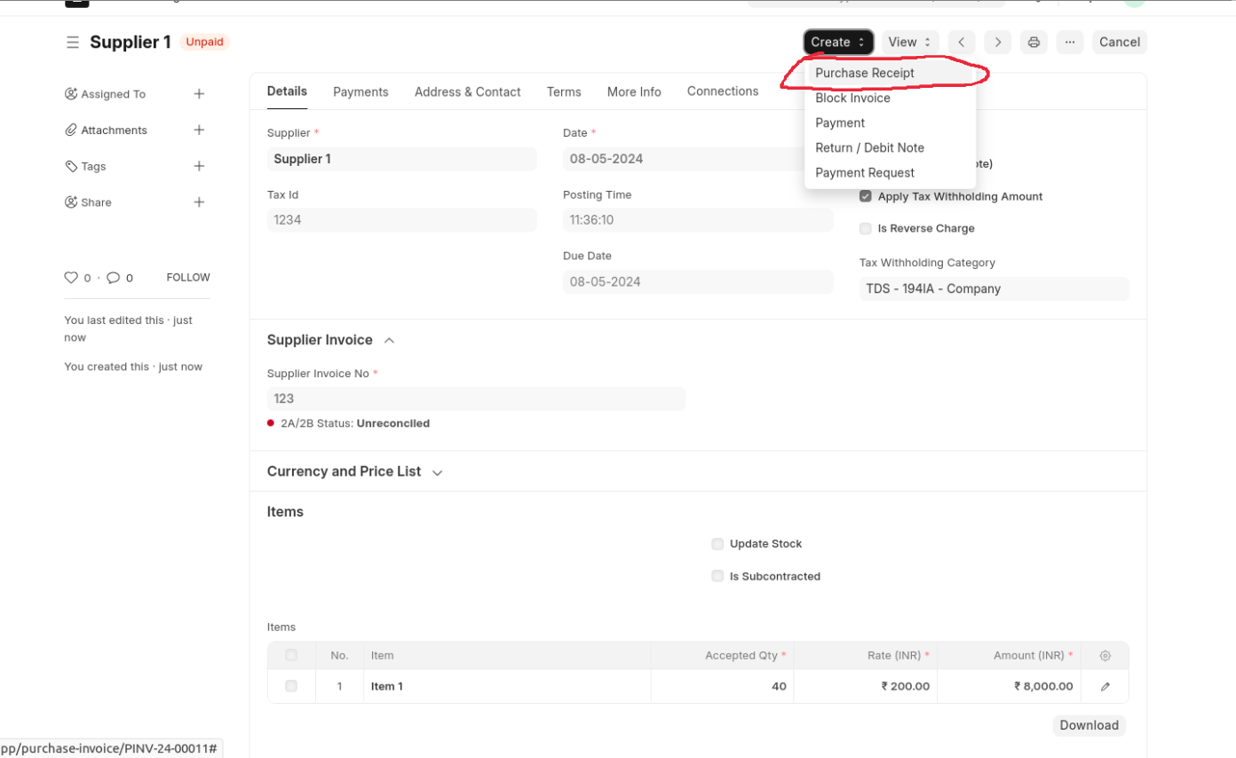 Create Purchase Receipt Against The Same Purchase Invoice