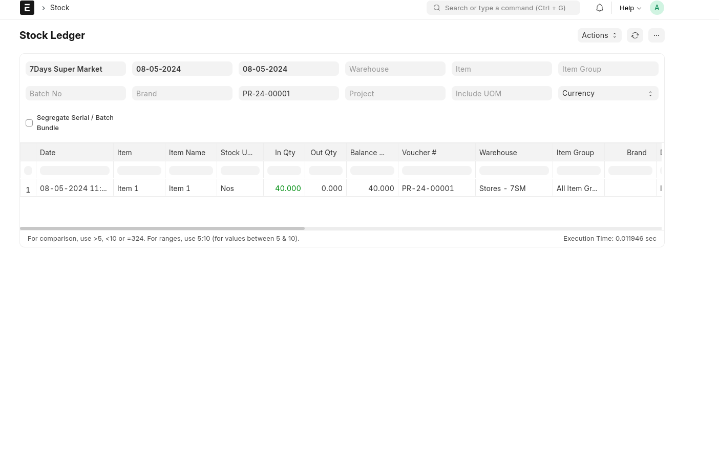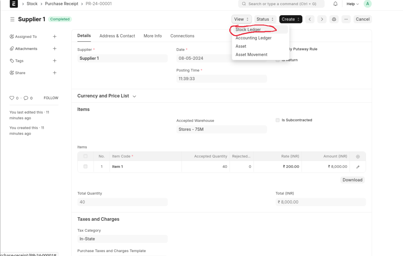 The item stock has arrived at the selected Target warehouse. Click 'View' and select 'Stock Ledger' to see the stock ledger details. The purchase cycle process is completed..