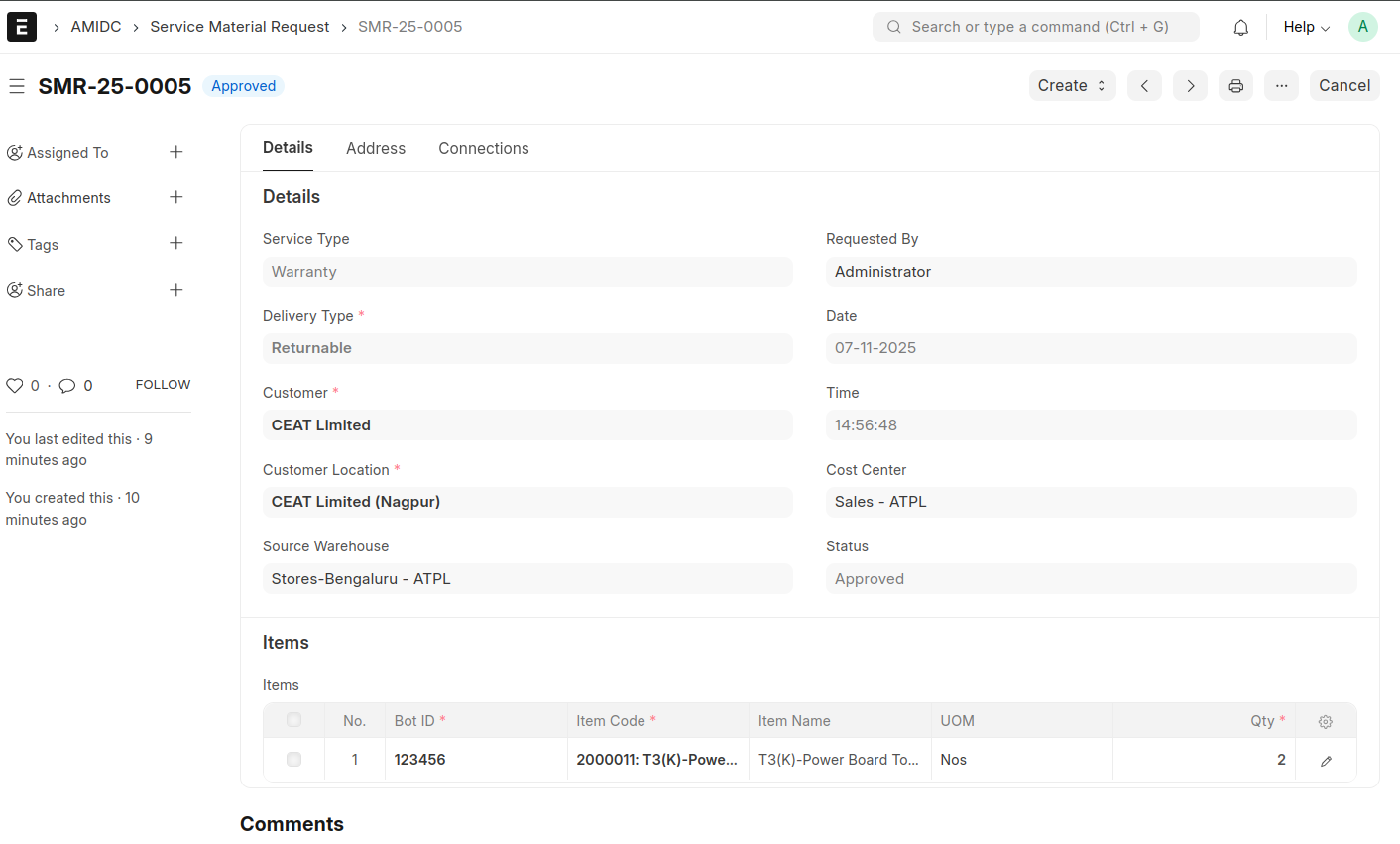 - While clicking the button, all the information from the Service Material Request will be fetched to Service Material Return.then save and submit the document.