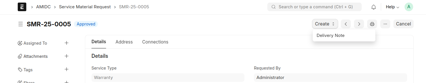 - Create Delivery Note after submit the Service Material Request.