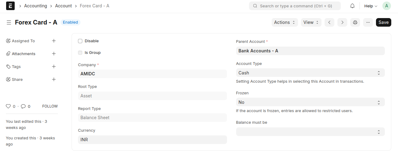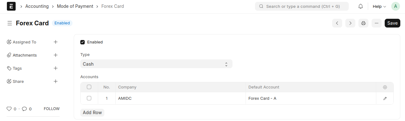 8. Create a Mode of Payment Mode of Payment name as Forex Card