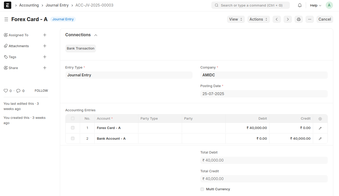A separate Journal Entry must be created for each Forex Card that is created