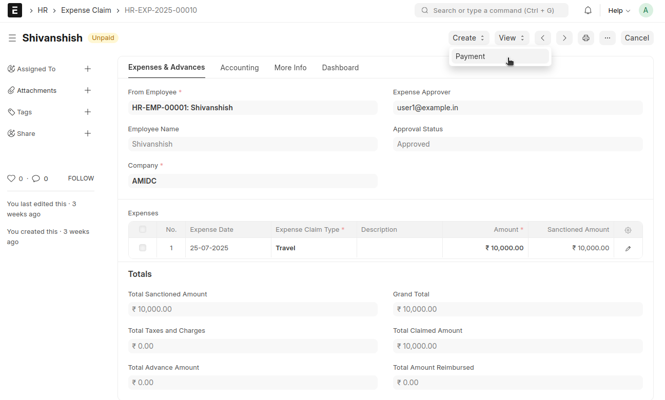 From Expense Claim → Click the 'Create' button → Select 'Payment'