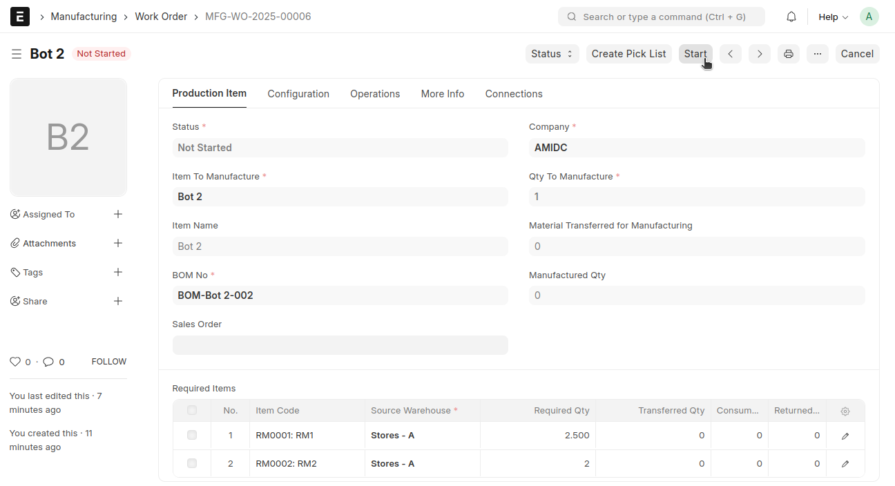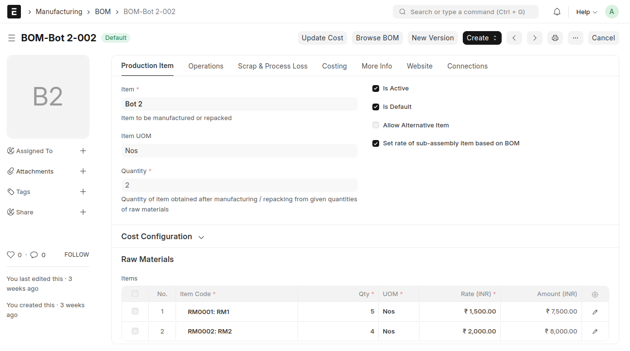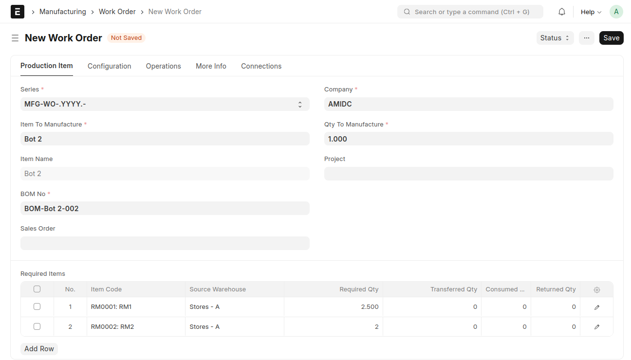 - Select the raw material items required to manufacture the Bot