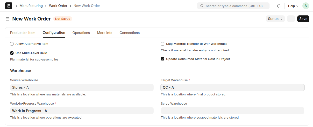 - Set a Work In Progress Warehouse
