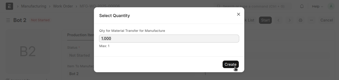 From the Work Order, click the 'Start' button, select the quantity, then click 'Create'