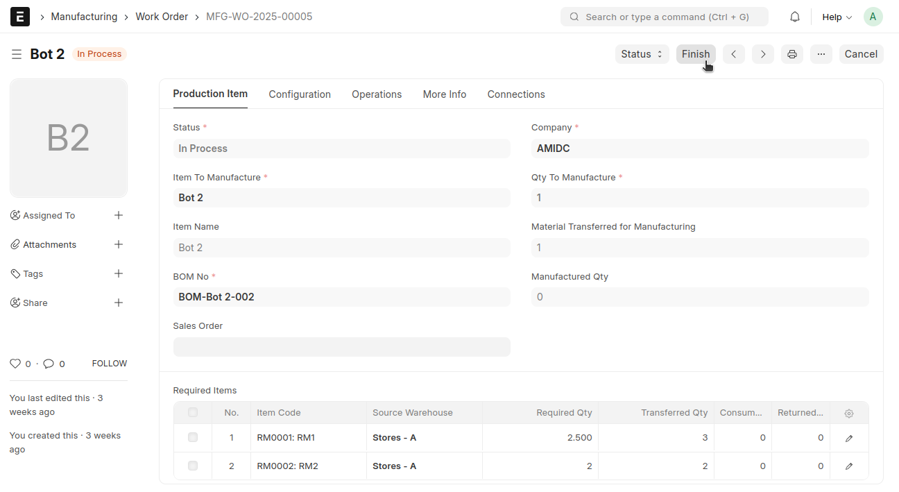 Here the manufactured item 'Bot' will move to the 'stores' Warehouse
