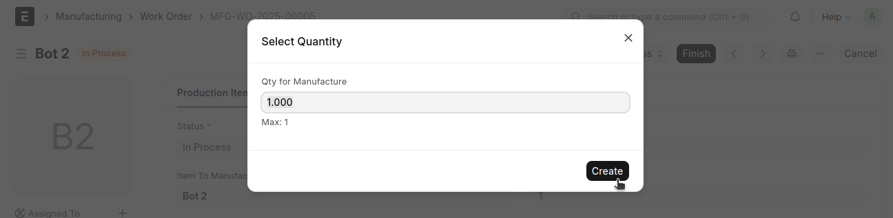 From the Work Order, click the 'Finish' button, select the quantity, then click 'Create'