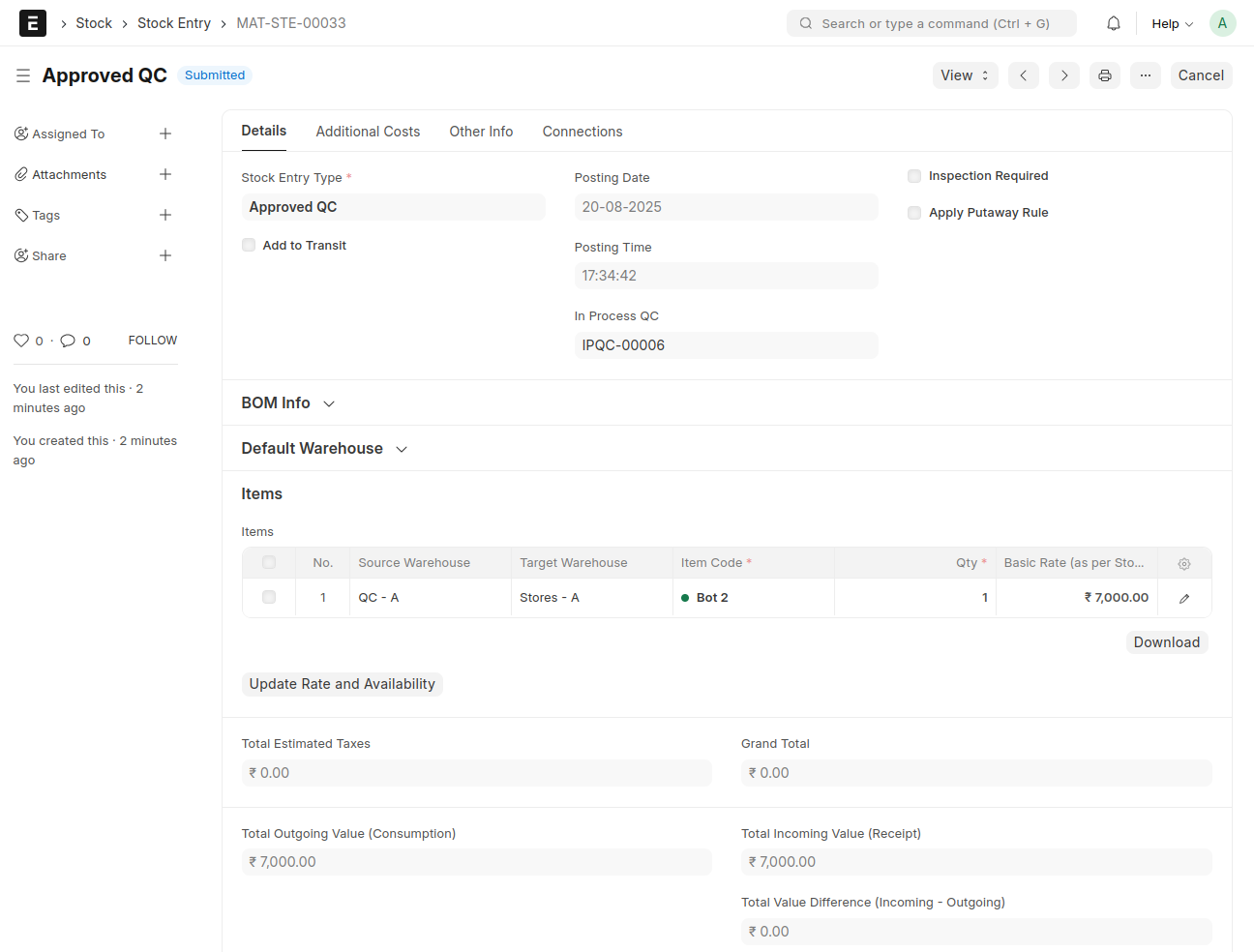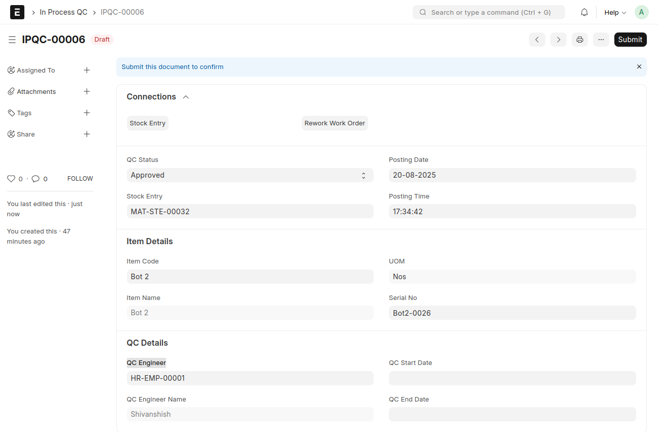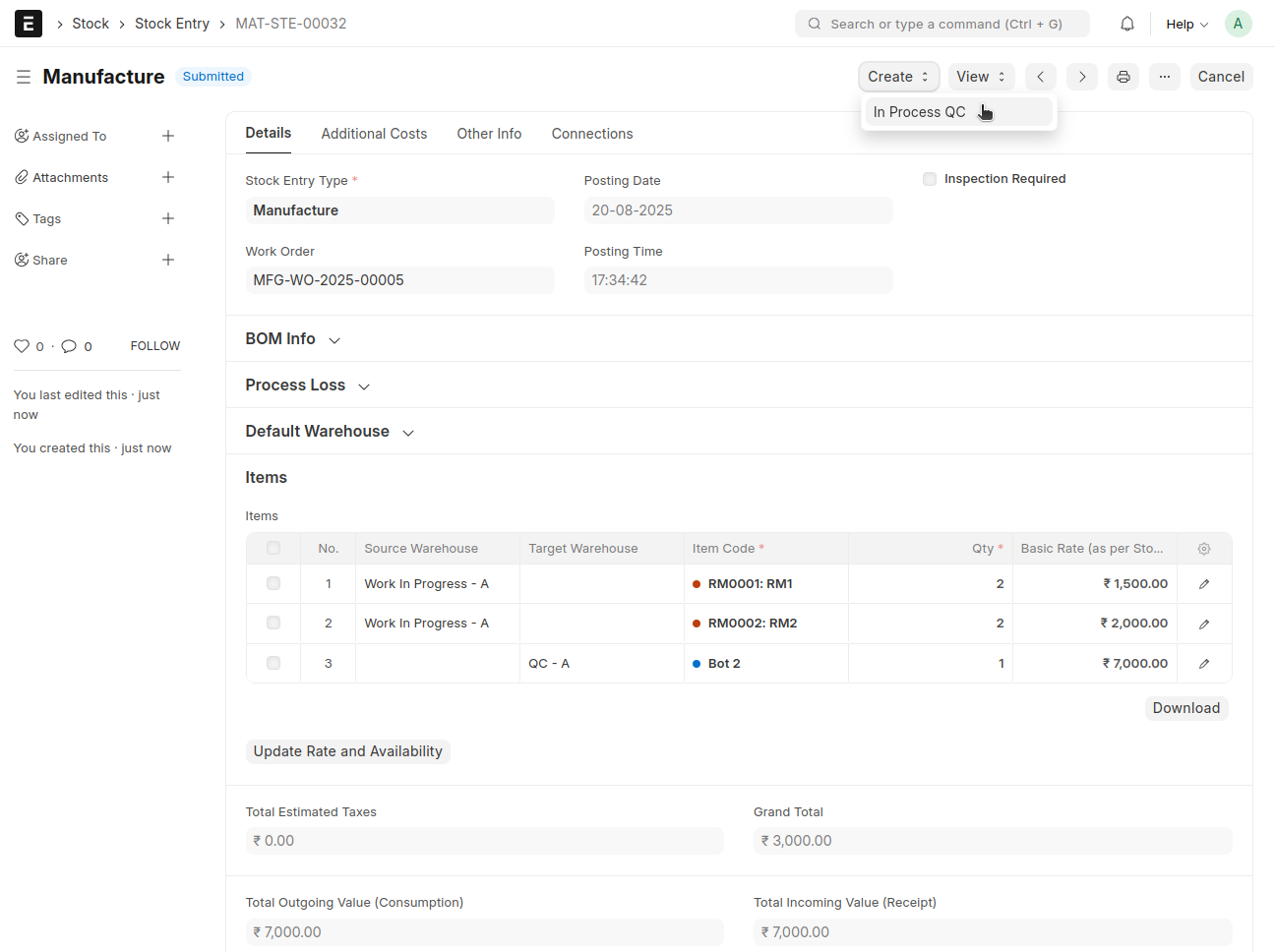 An In Process QC will be automatically created against this Manufacture Stock Entry