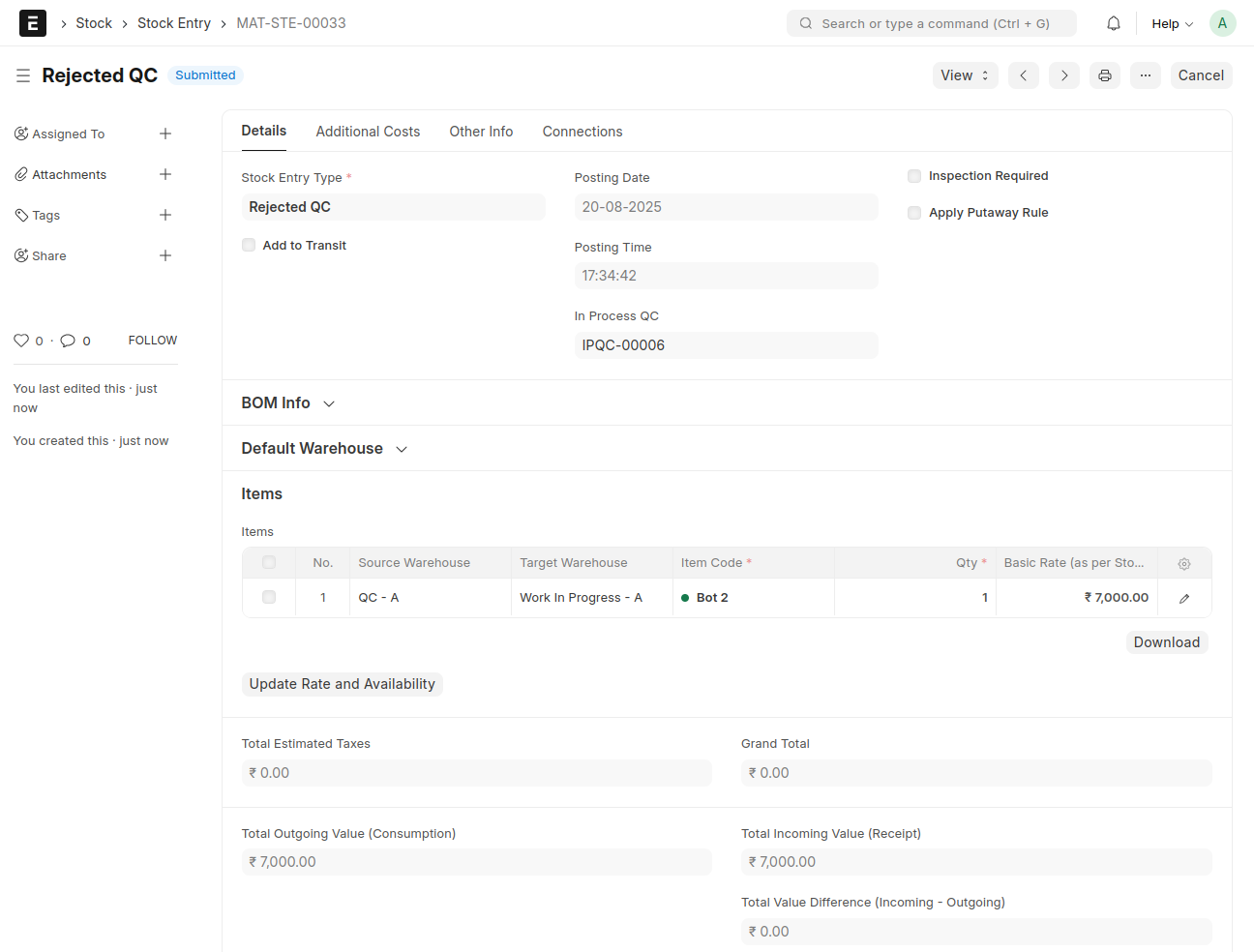And if the status is set to 'Rejected',a Stock Entry will be automatically created in a submitted state