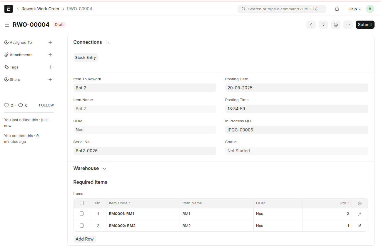 Along with the Stock Entry, a Rework Work Order will also be created