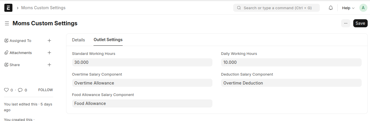 - Set Overtime Salary Component, Deduction Salary Component , and Food Allowance Salary Component in Moms Custom Settings.