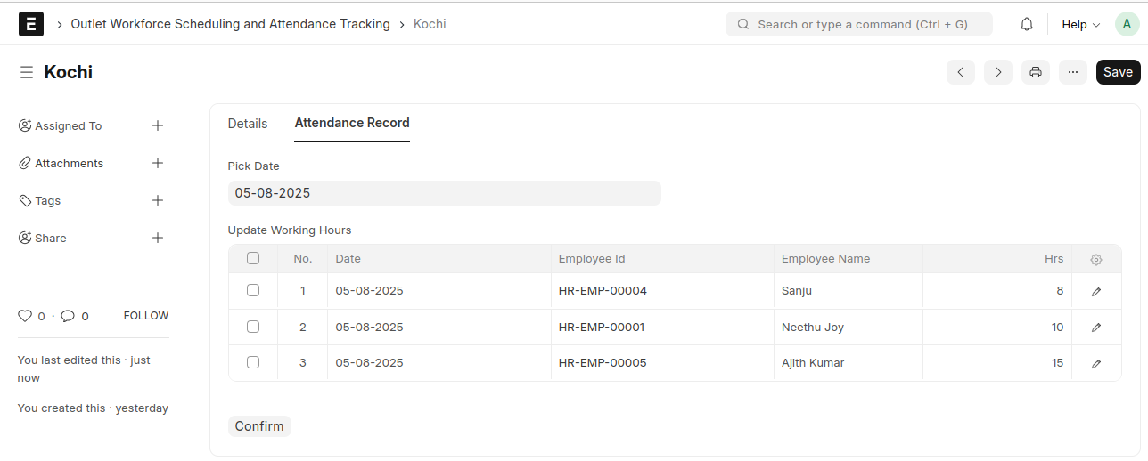 - When employees are added to the Outlet Workforce Details table, they are automatically populated in the Update Working Hours table with default values.