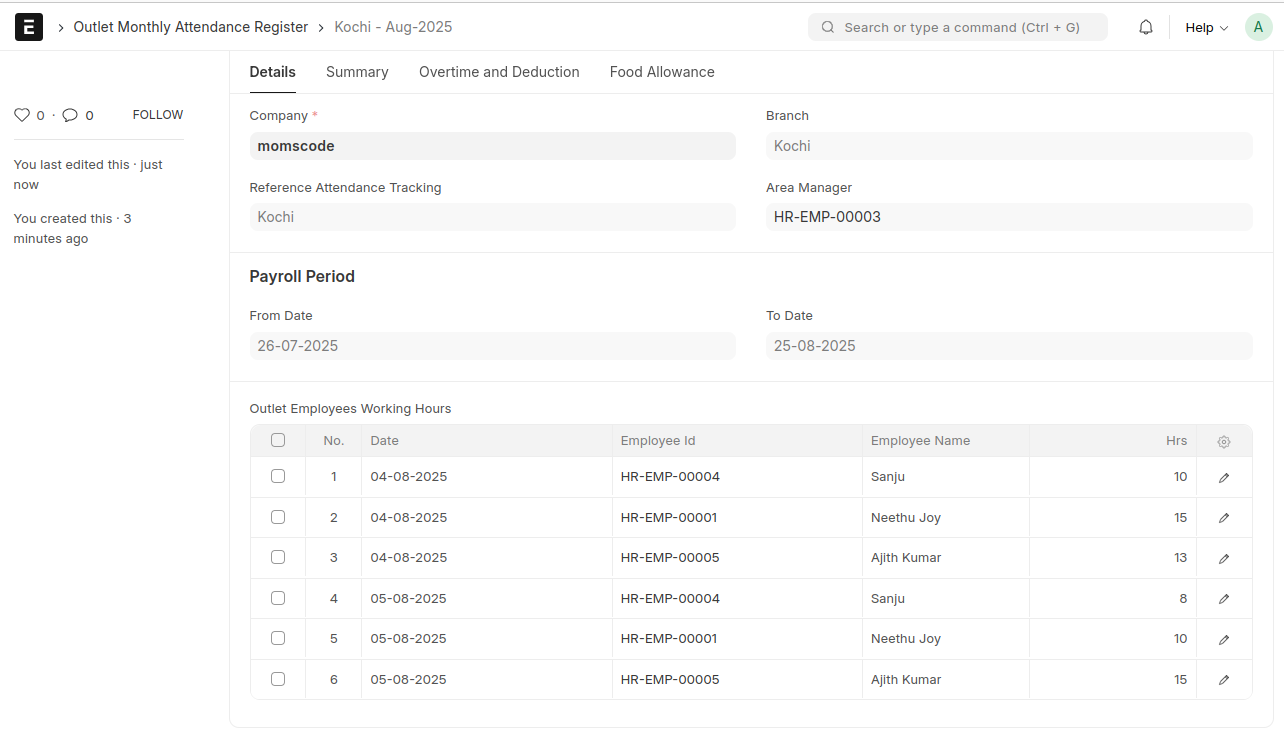 - After the Monthly Attendance Register is successfully created, all dates and hours in the Update Working Hours table are cleared, and the Pick Date field is reset.