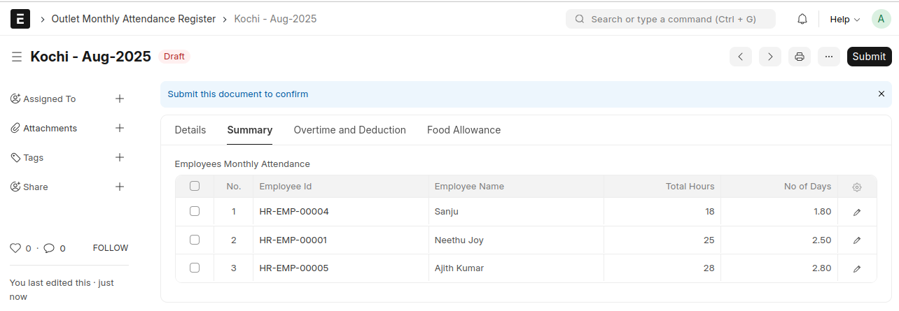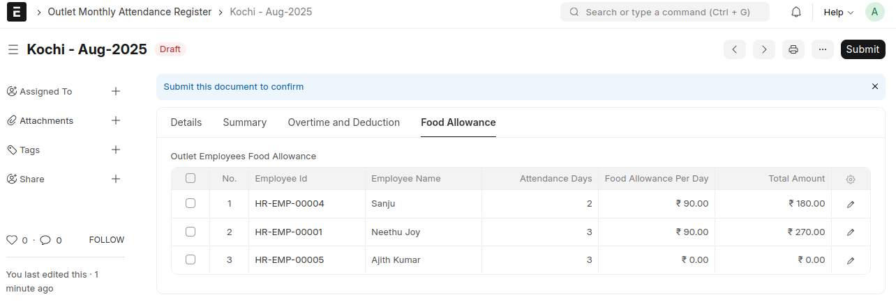 - If the Outlet Employees Food Allowance table contains entries, the system automatically creates Food Allowance Additional Salary records for each employee when the document is submitted.