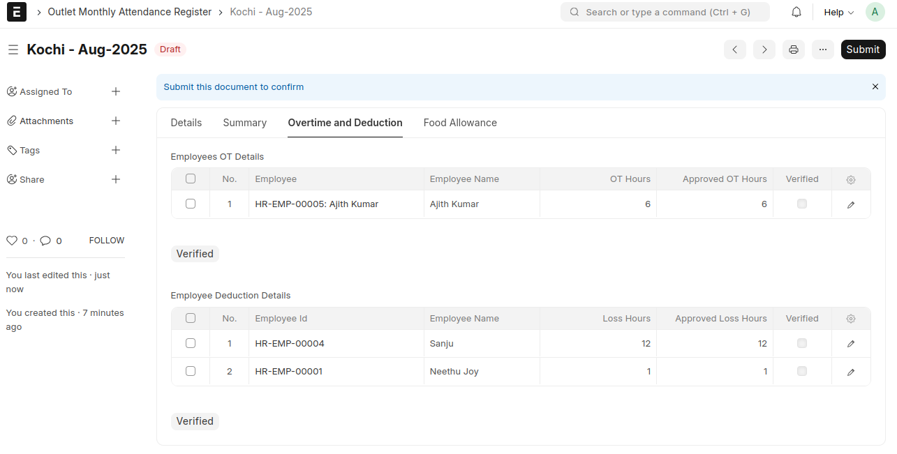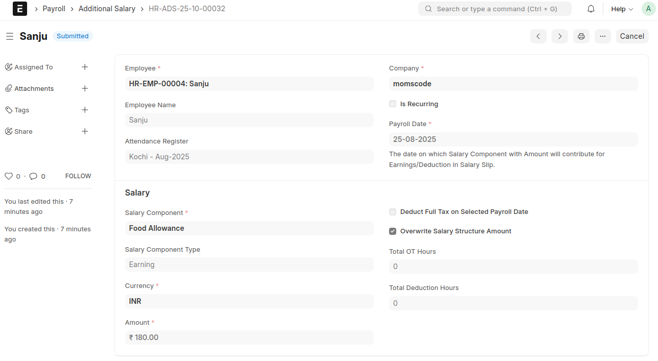 - If the Employees OT Details table contains approved OT entries, the system automatically creates OT Additional Salary records for each employee when the document is submitted.