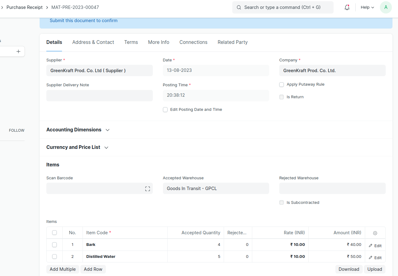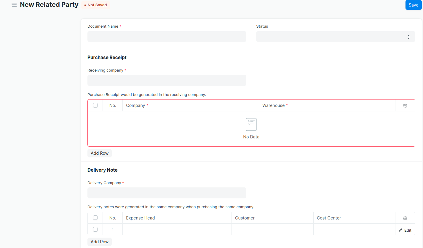 - Before creating Purchase Receipt and Delivery Note , you will create Related Party document.That is one time task.