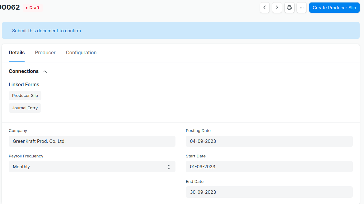 --> Submitting Producer Slips one by one manually will not create the Journal Entry to