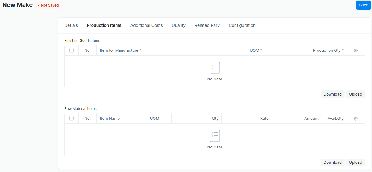 - Raw material items will be automatically fetched to the table ‘Raw Material