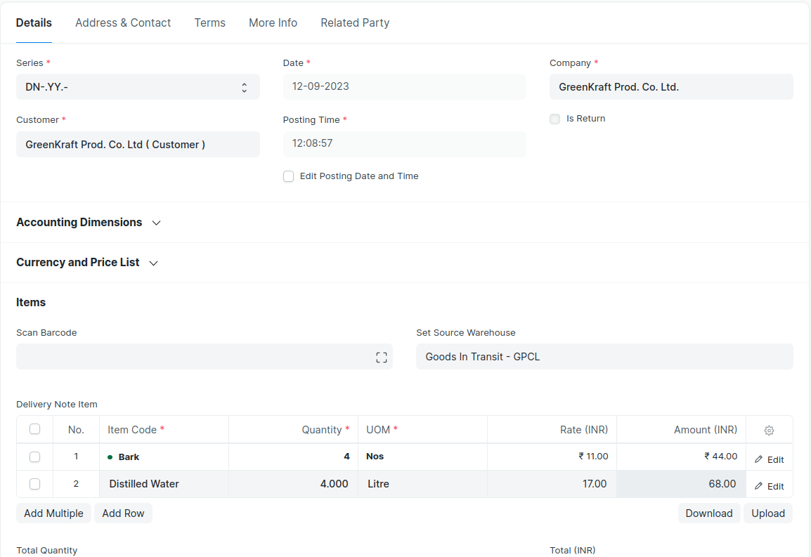 --> A Delivery Note is made when a shipment is shipped from the company’s Warehouse