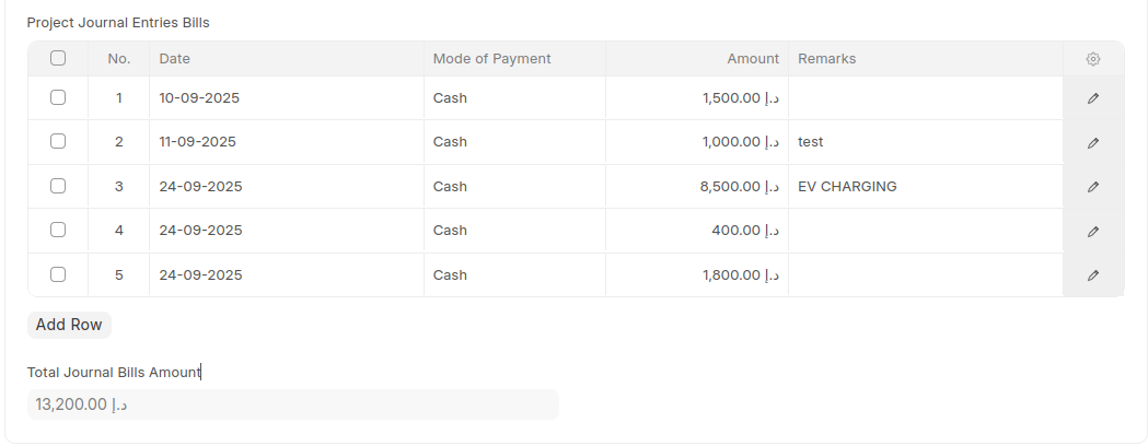 When a journal entry is submitted with a project linked in it, the details — such as date, party, amount, mode of payment, and remarks — are automatically populated in the Project Journal Entries Bills child table of the corresponding Project document.The total amount from the table is then displayed in the Total Journal Bills Amount field.