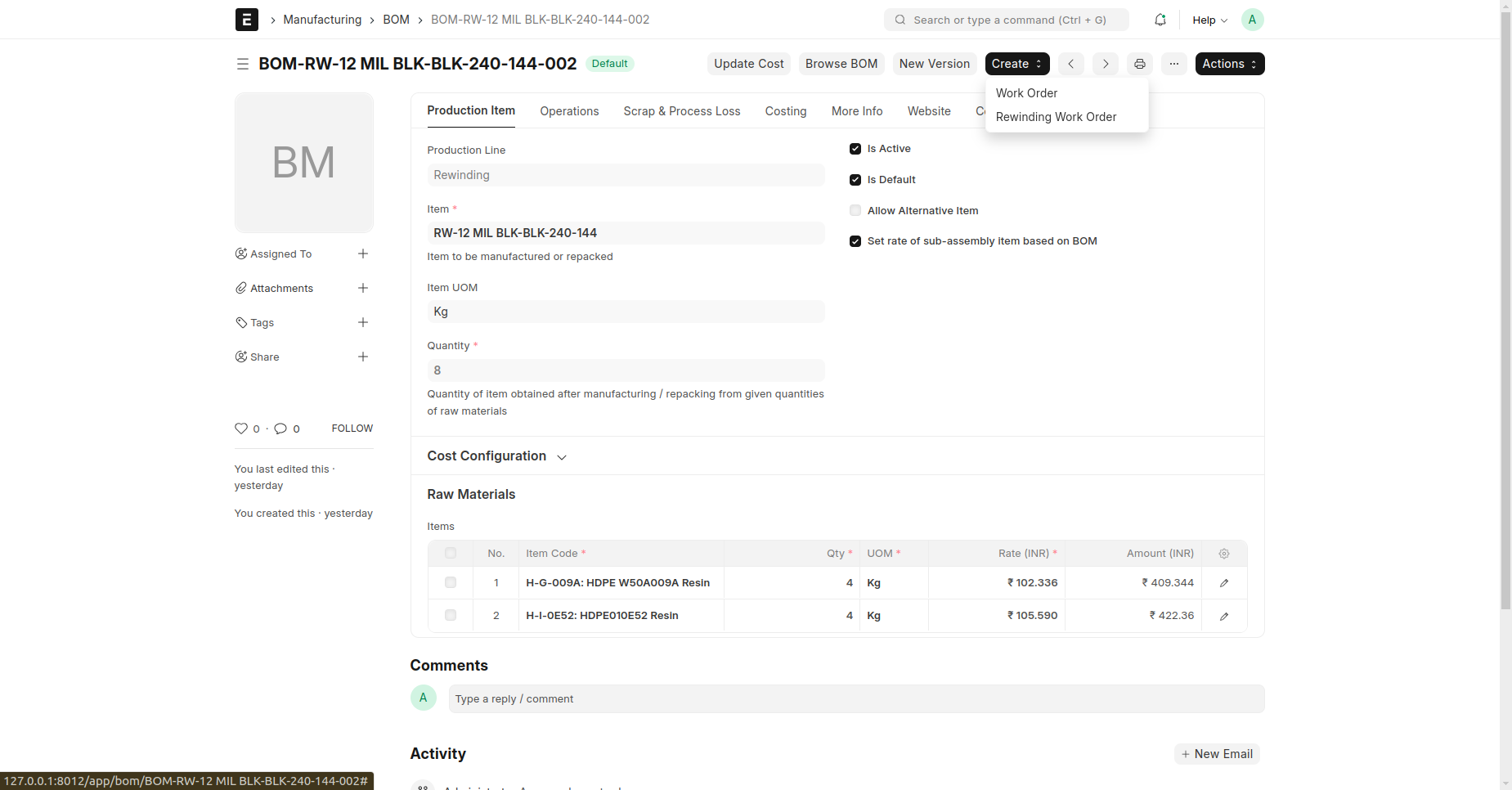 Location: After submitting a BOM, a button named "Rewinding Work Order" appears on the BOM form. Function: Clicking this button generates a Rewinding Work Order based on the BOM items and raw materials. Action: Creates a new Rewinding Work Order document using the details from the BOM. Redirection: After creation, you are redirected to the Rewinding Work Order doctype.