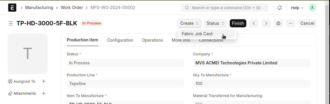 After creation of BOM and Work Order > A button comes in Work Order > Create > Fabric Job Card