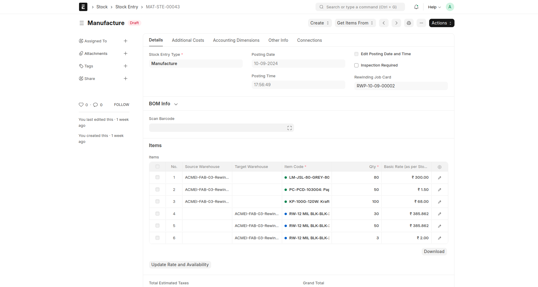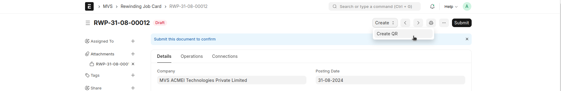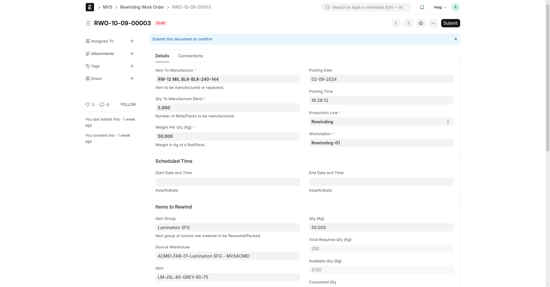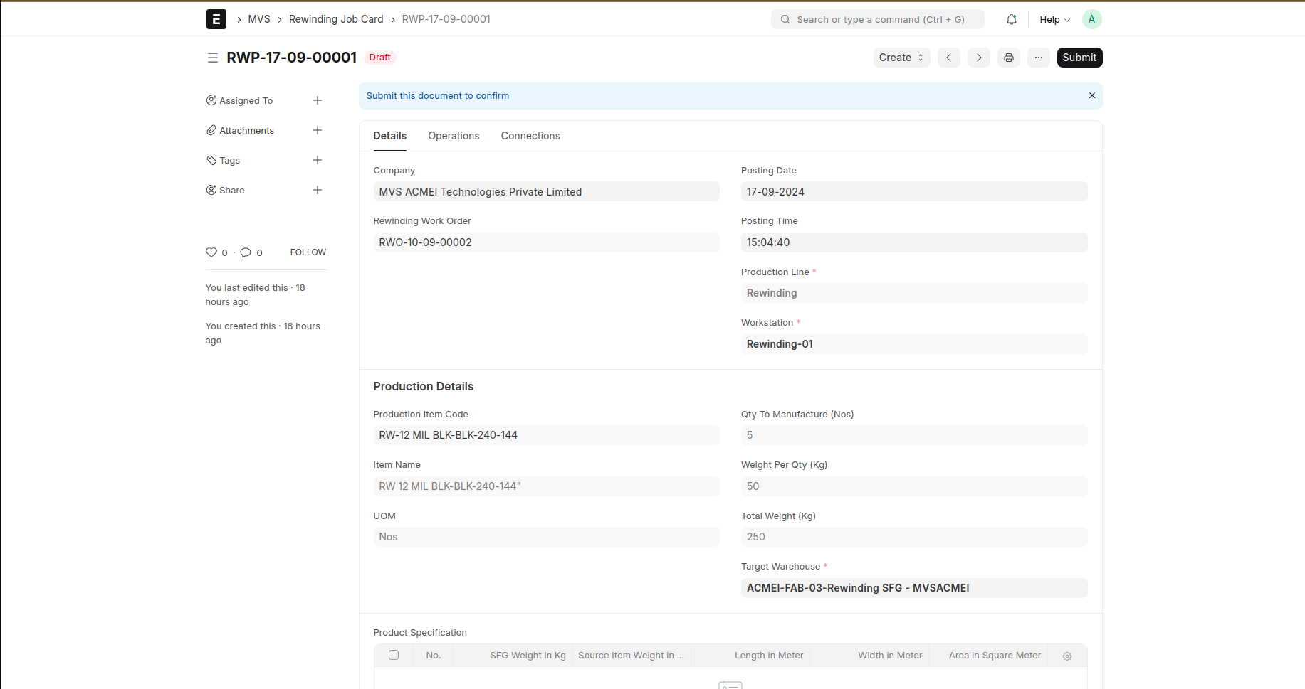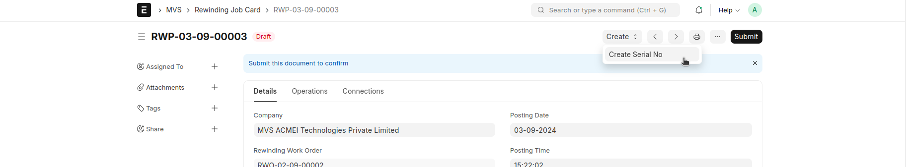 The Rewinding Job Card facilitates tracking and managing the manufacturing process defined in the Rewinding Work Order. Here’s a detailed guide on completing and finalizing the Rewinding Job Card: